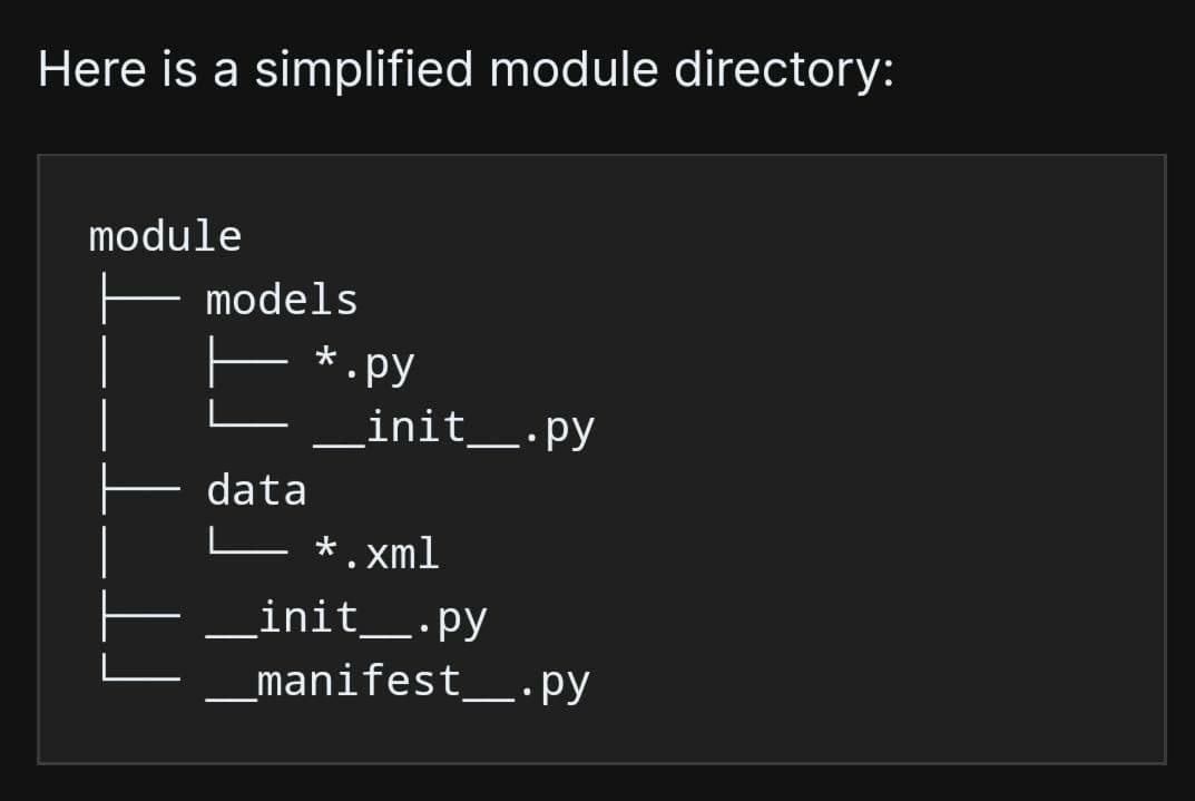 Un módulo de Odoo se declara mediante su manifiesto. Cuando este, incluye objetos comerciales (es decir, archivos de Python), se organizan como un paquete de Python con un archivo __init__.py . Dicho archivo, contiene instrucciones de importación para varios archivos de Python en el módulo.